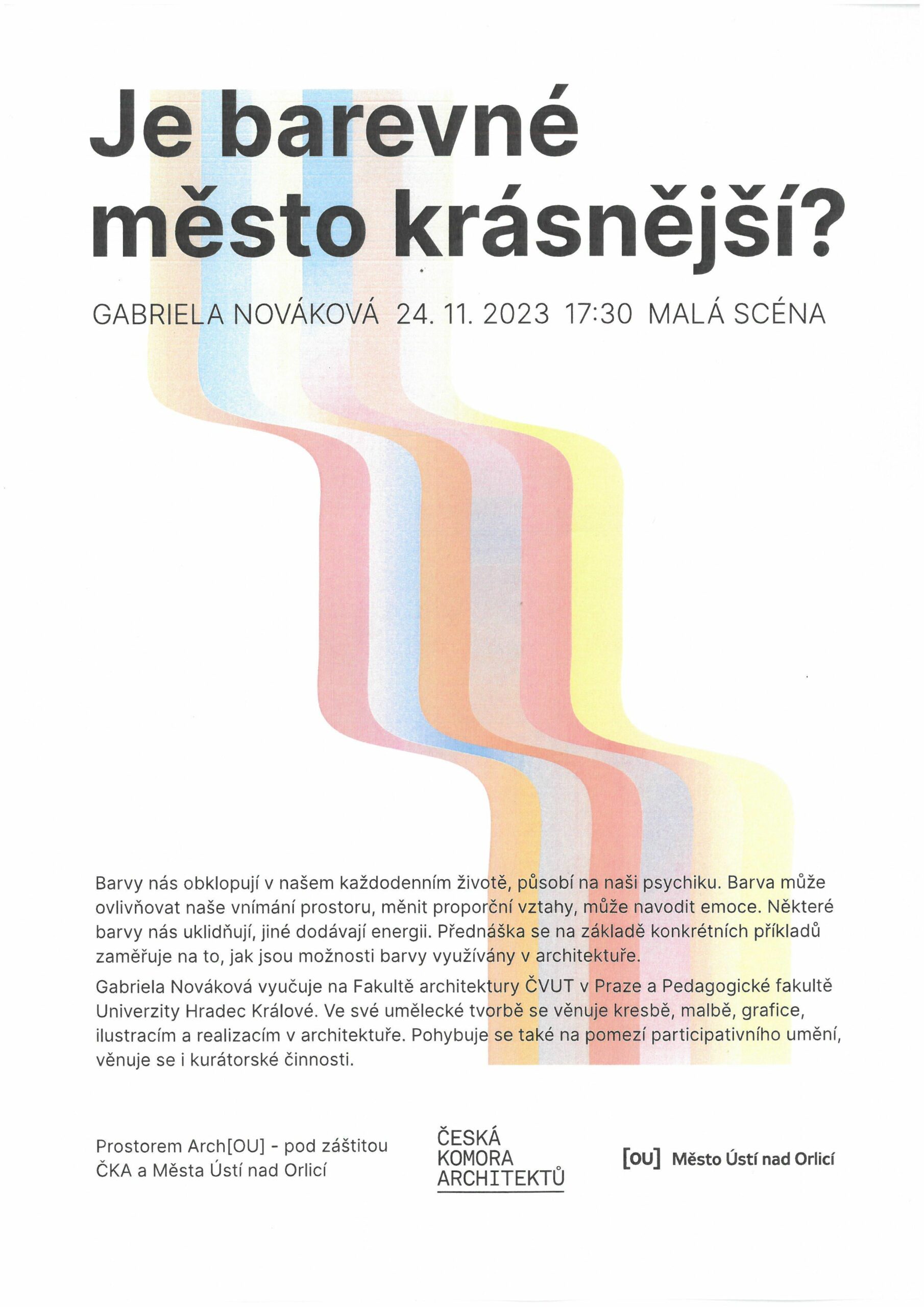 Dne 24. listopadu 2023 v 17:30 jste zváni do Malé scény v Ústí nad Orlicí na přednášku o možnostech barev využívaných v architektuře. Přednášející Gabriela Nováková vyučuje na Fakultě architektury ČVUT v Praze a Pedagogické fakultě Univerzity Hradec Králové.