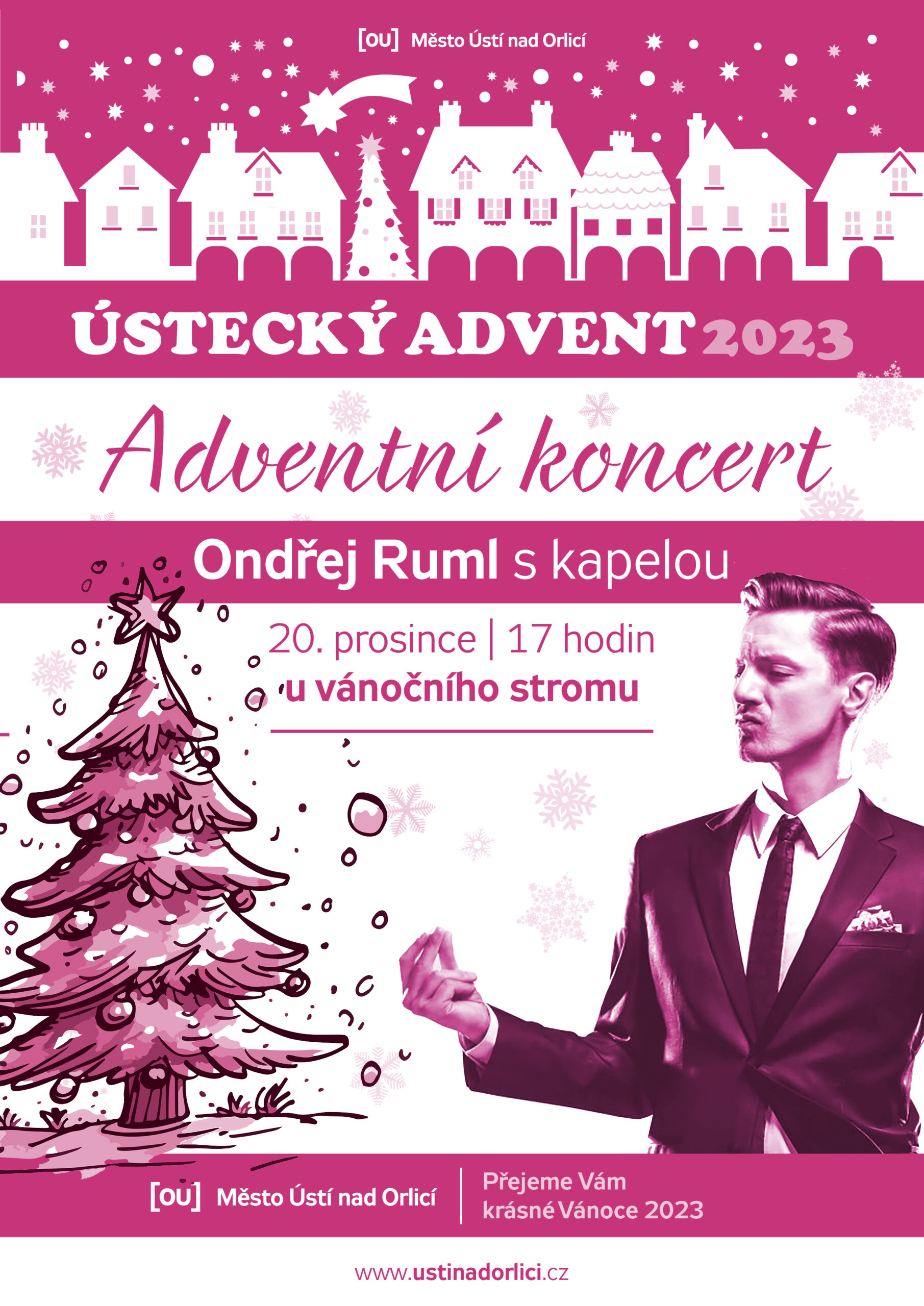 Ve středu 20. prosince v 17 hodin jste zváni na Mírové náměstí v Ústí nad Orlicí, kde vystoupí Ondřej Ruml s kapelou. Ondřej Ruml je všestranný zpěvák a hudebník, který spolupracuje s významnými českými umělci. Společně s kvintetem Mateje Benka zaujali veřejnost i kritiky svými novými aranžemi známých písní Ježka, Voskovce a Wericha.