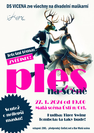 V sobotu 27. ledna 2024 v 19 hodin se můžete zúčastnit dalšího ročníku PLESU NA SCÉNĚ v Malé scéně v Ústí nad Orlicí. Tentokrát na téma Zvěřinec. Hudba: Tiger Swing. Tombola: ta taky bude! Soutěž o nejlepší masku.