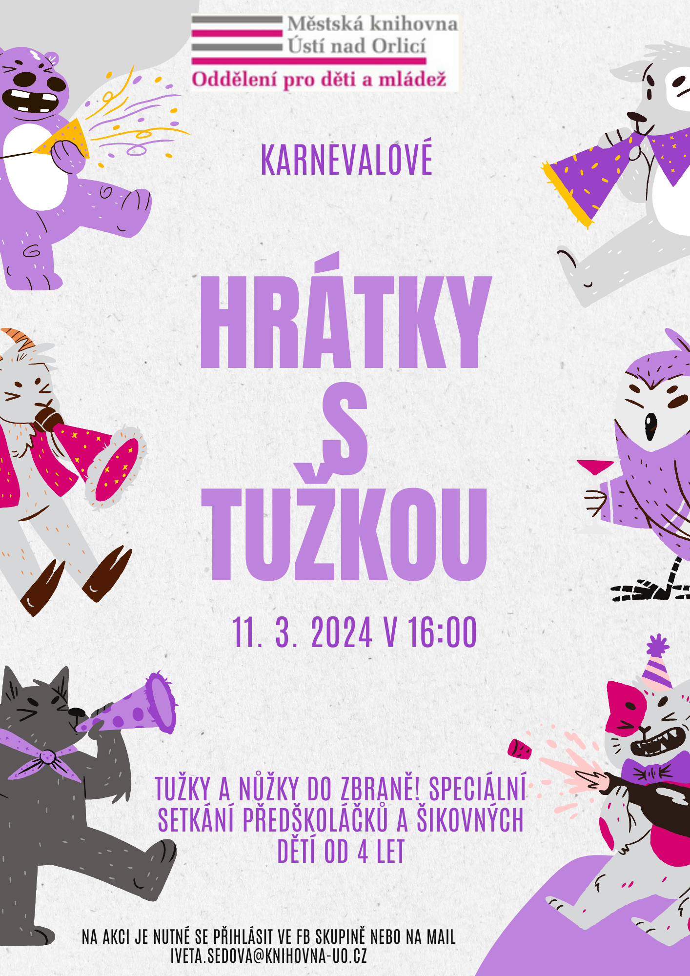 Dne 11. března 2024 zveme děti od 4 let do Městské knihovny v Ústí nad Orlicí na výtvarnou dílnu Karnevalové hrátky s tužkou. Na akci je nutné se přihlásit na mail: iveta.sedova@knihovna-uo.cz