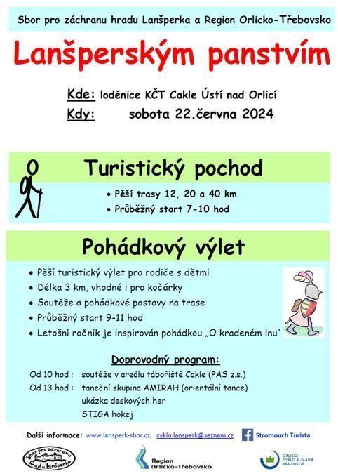 Sbor pro záchranu hradu Lanšperka a Region Orlicko-Třebovsko pořádají turistický pochod Lanšperským panstvím v sobotu 22. června 2024. Start: 7 – 10 hodin v areálu tábořiště Cakle, cíl: do 17 hodin tamtéž.