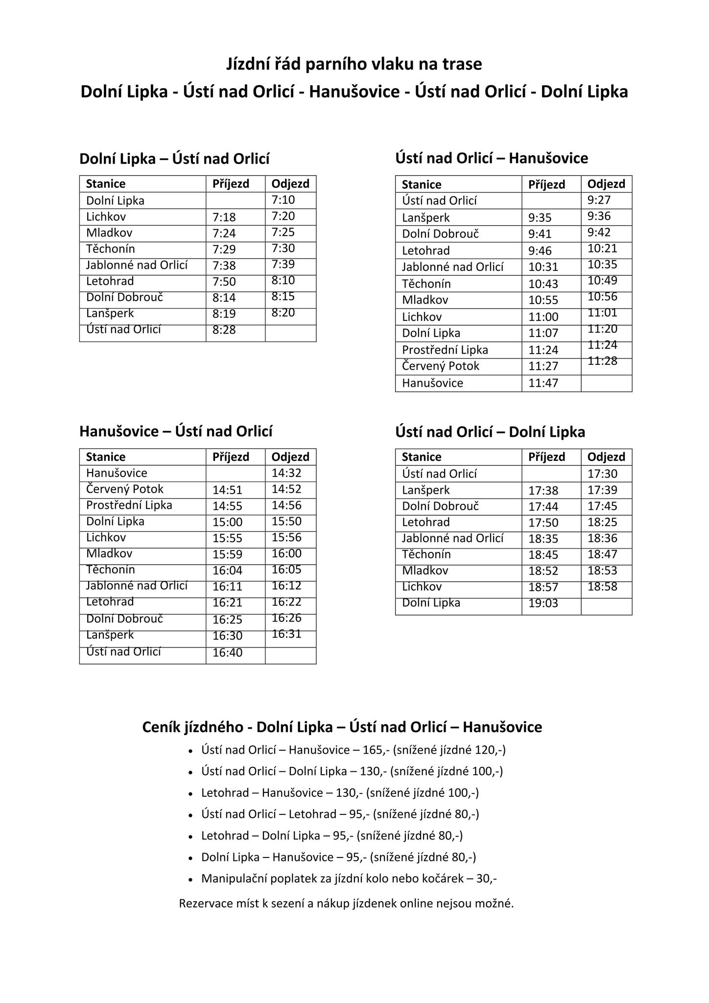 Také v letošním roce jsou letní měsíce v Pardubickém kraji spojené s pravidelnými jízdami historických parních vlaků. Od poslední červnové soboty jezdí na turisty velmi oblíbené trase z Dolní Lipky přes Letohrad a Ústí nad Orlicí až do Hanušovic v Olomouckém kraji. V nabídce jsou také trasy z Dolní Lipky přes Českou Třebovou a Moravskou Třebovou až do Svitav a z Dolní Lipky přes Hradec Králové a Týniště nad Orlicí až do Žamberku s cílovou stanicí opět v Dolní Lipce.