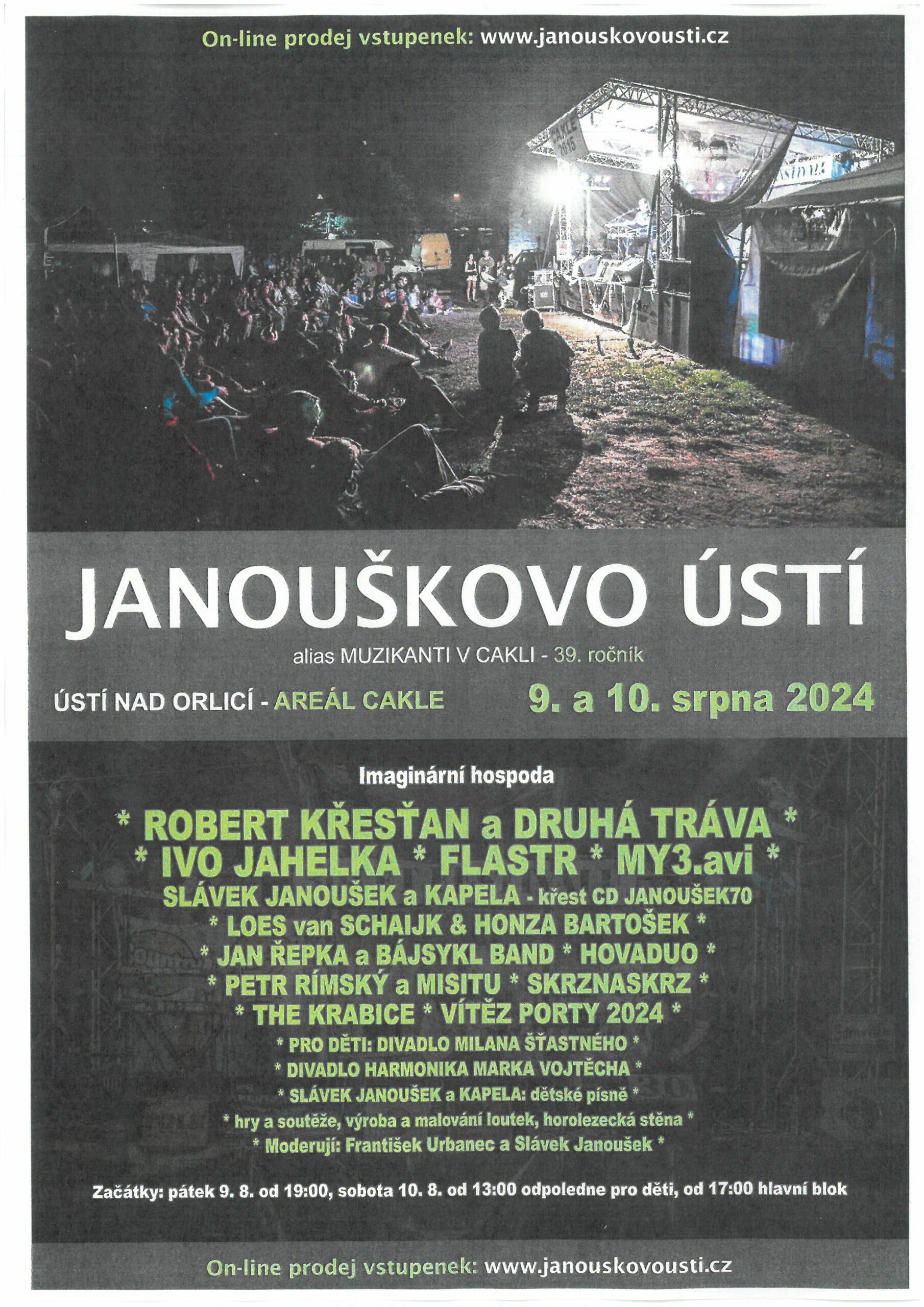 Ve dnech 9. a 10. srpna 2024 jste srdečně zváni do vodáckého tábořiště v Cakli na Janouškovo Ústí alias Muzikanti v Cakli. Začátky: v pátek 9. srpna od 19 hodin, v sobotu 10. srpna od 13 hodin odpoledne pro děti, od 17 hodin hlavní blok. On-line prodej vstupenek: www.janouskovousti.cz