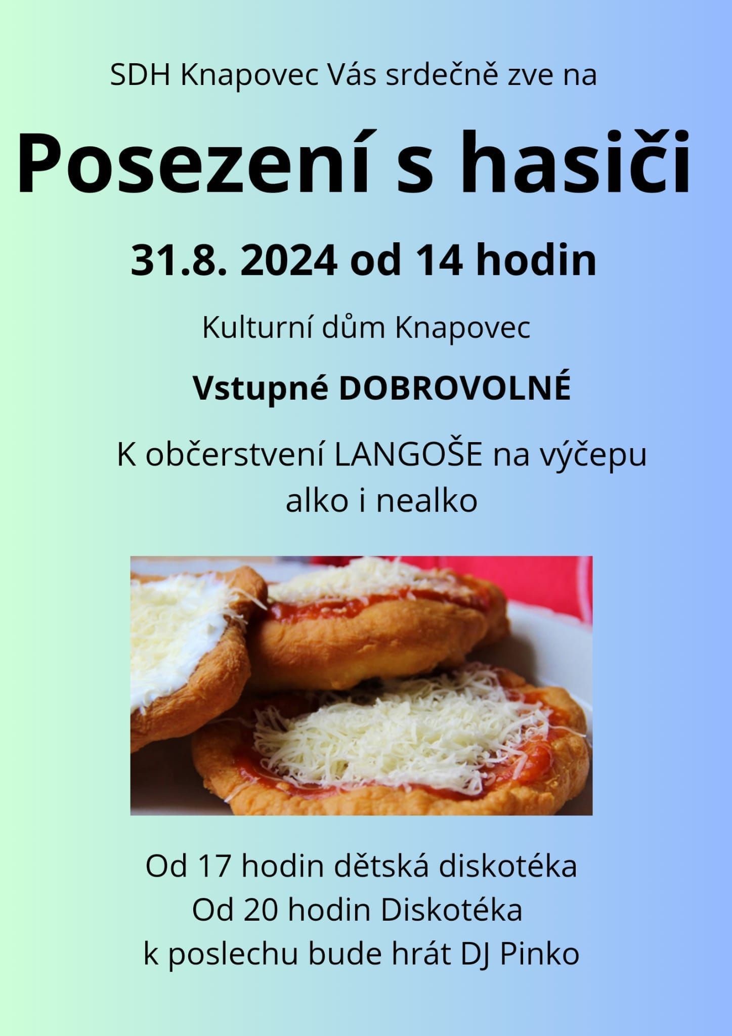 Sbor dobrovolných hasičů Knapovec Vás srdečně zve na Posezení s hasiči dne 31. srpna 2024 od 14 hodin v Kulturním domě v Knapovci. Vstupné dobrovolné. K občerstvení LANGOŠE, alko i nealko. Od 17 hodin dětská diskotéka, od 20 hodin pro dospělé.