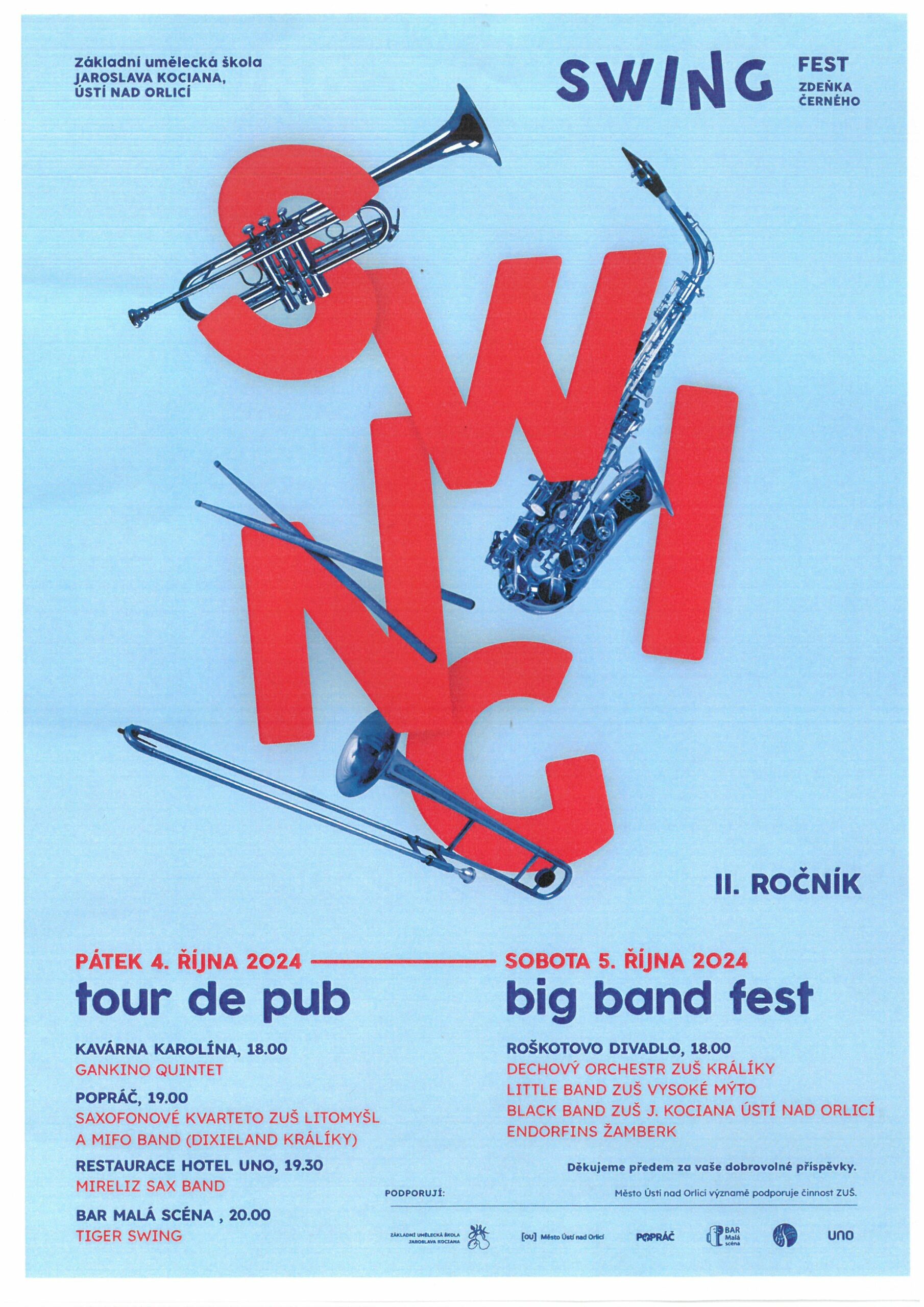Ve dnech 4. – 5. října 2024 Vás srdečně zveme do Ústí nad Orlicí na 2. ročník Swing Festu Zdeňka Černého. V pátek se budete moci projít po místních restauracích a klubech, kde nasajete hudební, swingovou a jazzovou atmosféru. V sobotu se pak na Vás budeme těšit na přehlídce big bandů v Roškotově divadle.