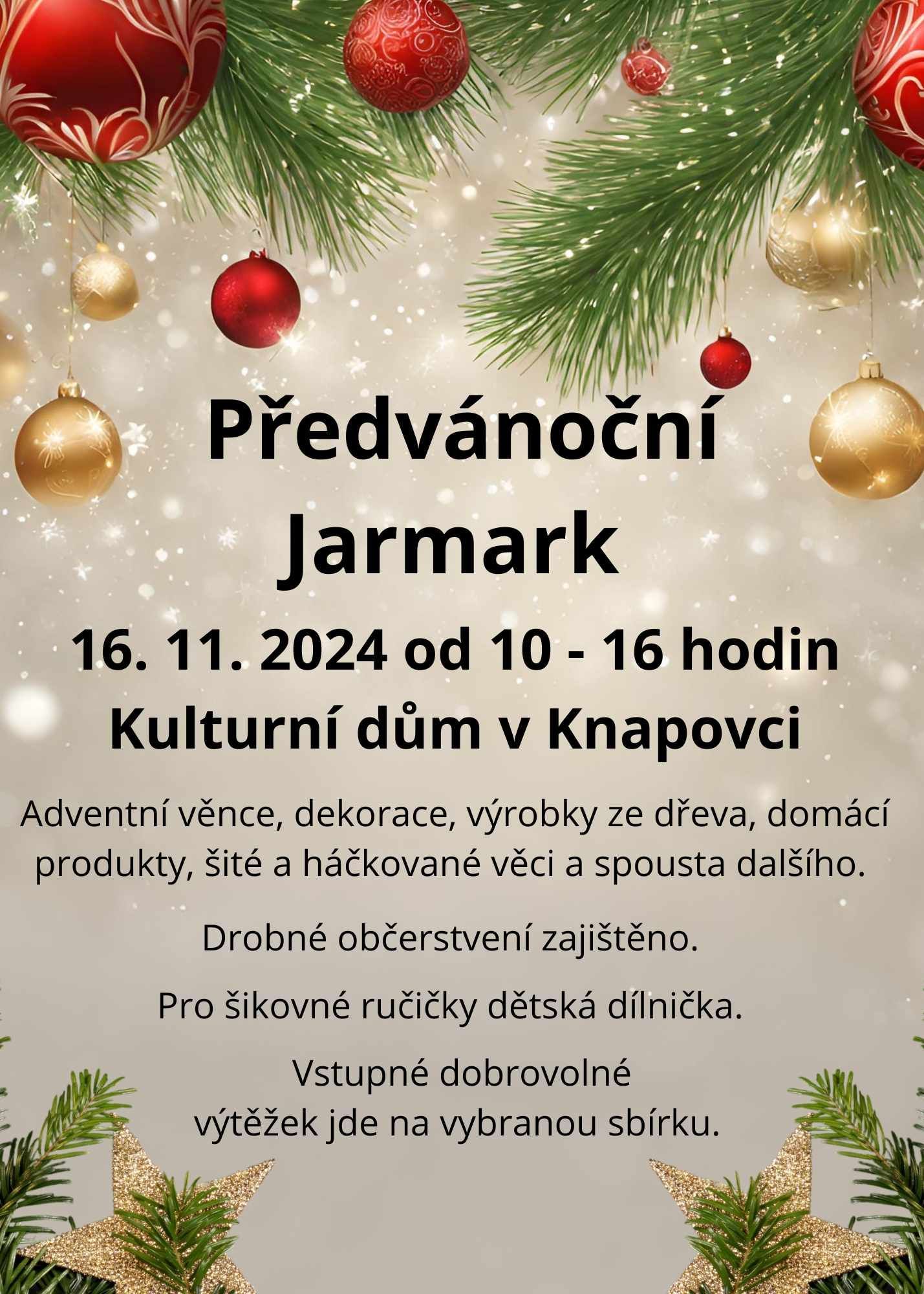 V sobotu 16. listopadu 2024 od 10 do 16 hodin jste zváni do Kulturního domu v Knapovci na PŘEDVÁNOČNÍ JARMARK. K zakoupení budou adventní věnce, dekorace, výrobky ze dřeva… Připravena bude dětská dílnička. Drobné občerstvení zajištěno. Vstupné dobrovolné, výtěžek půjde na vybranou sbírku.