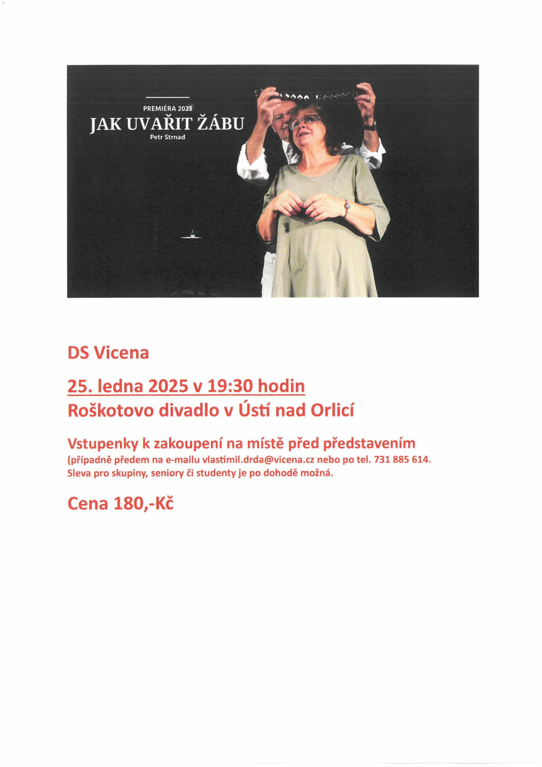 V sobotu 25. ledna 2025 v 19.30 hodin Vás zveme do Roškotova divadla v Ústí nad Orlicí na divadelní hru Jak uvařit žábu. Hlavní hrdinka Blažena stojí před soudem. Při procesu se ve vzpomínkách vrací k důležitým momentům a osudovým mužům svého života. Obhájí svá rozhodnutí a své činy nejen před soudem, ale především sama před sebou? Nebo je pouze žábou, která se pomalu vaří na dně hrnce?